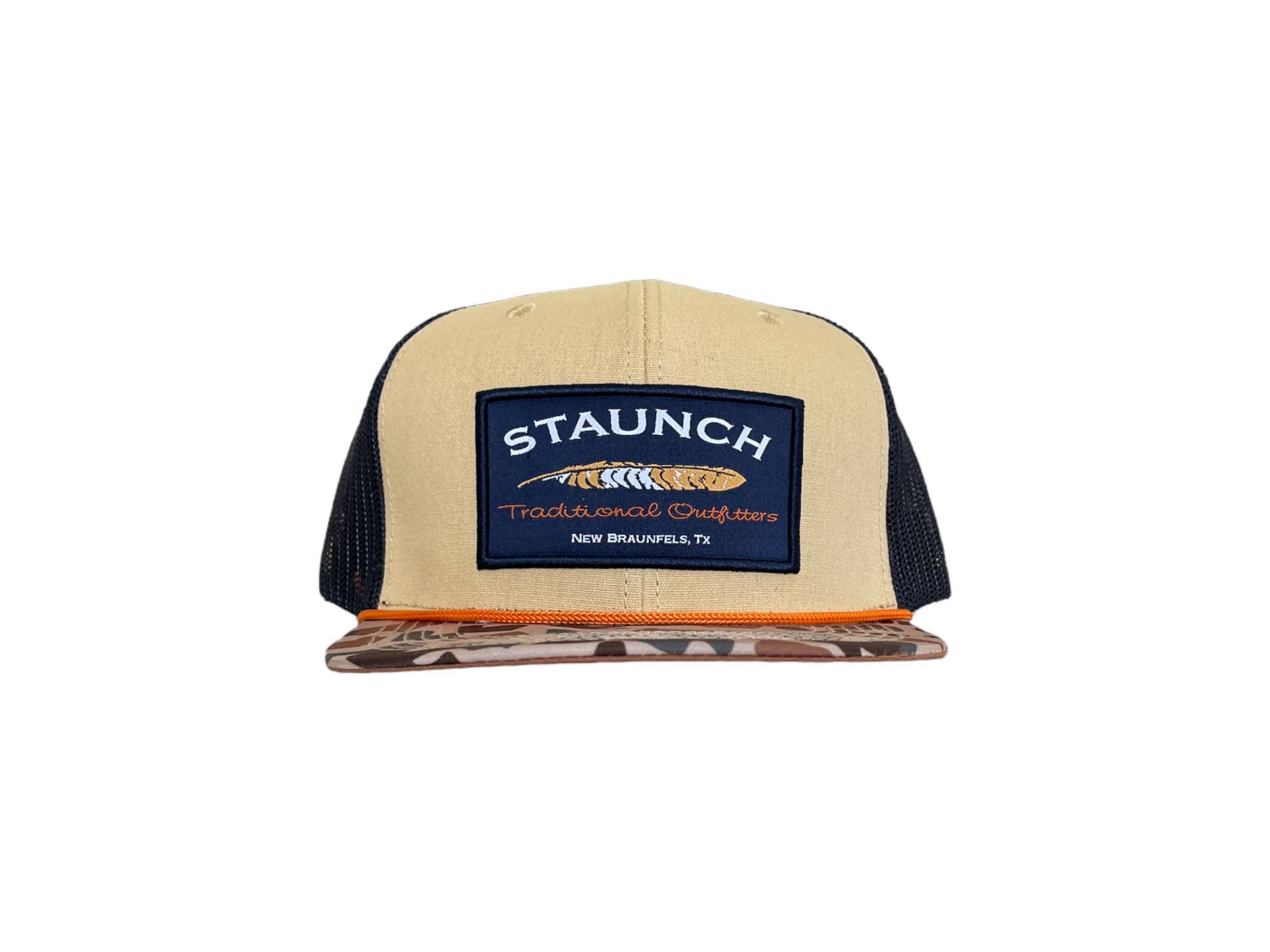With a breathable mesh back, structured mid-height crown, and adjustable snapback fit, this hat is ready for lake days, road trips, and laid-back weekends. The buckskin, navy, and camo colorway paired with the bright rope detail gives it just enough edge to stand out.