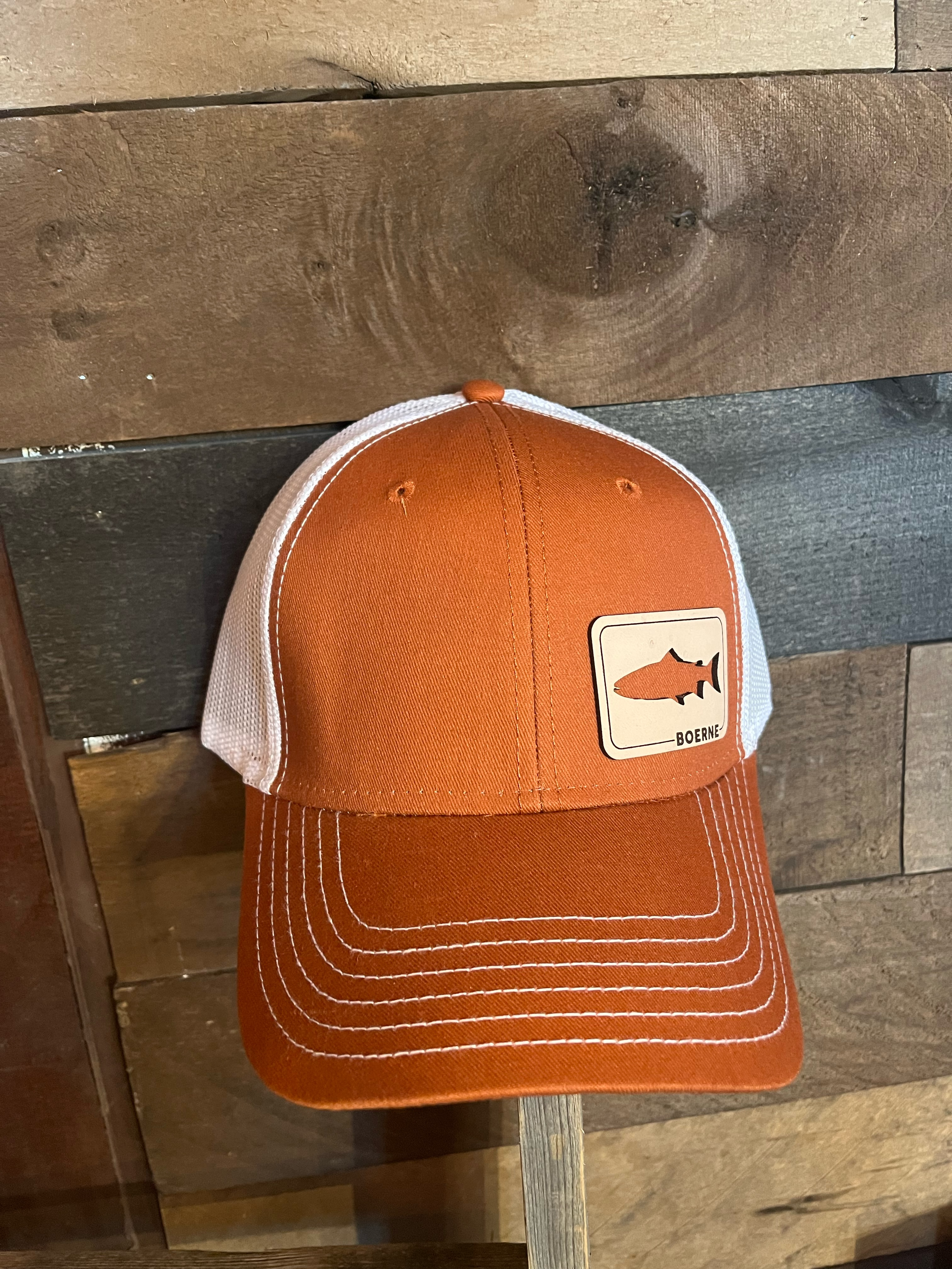 Our cut-out fish leather patch custom "Boerne" snapback hat , available in multiple colors.